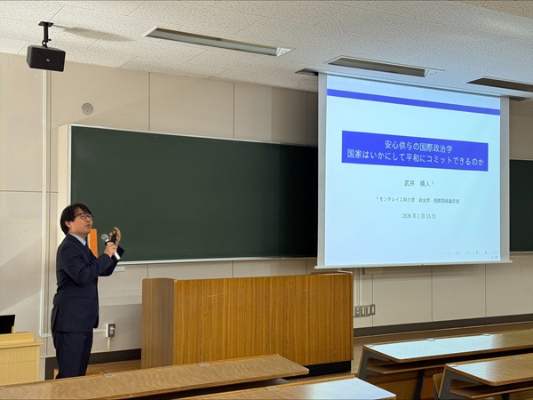 1月15日(木)2限に、モンテレイ工科大学 政治学・国際関係論学部助教・武井槙人先生による講演会が開催されました。講演のテーマは「安心供与の国際政治学―国家はいかにして平和にコミットできるのか」。近年の平和主義をめぐる動向について、「安心供与」という観点から、実験結果を交えてお話しいただきました。