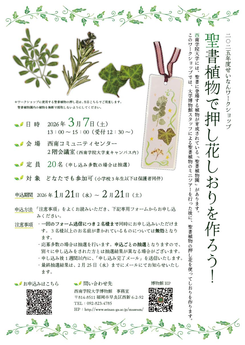 ※使用する押し花は、当日こちらで用意いたします。聖書植物園内の植物を無断で採取しないようにしてください。 日時:2026年3月7日(土)13:00~15:00 会場:西南コミュニティーセンター2階会議室(西南学院大学東キャンパス内) 定員:20名 対象:どなたでも(小学校3年生以下は保護者同伴) 申込方法:「注意事項」をよくお読みいただき、下記専用フォームからお申し込みください。申込期間は2026年1月21日(水)10時~2月21日(土)までです。 ----------- 注意事項 ・一回のフォーム送信につき2名様まで同時にお申し込みいただけます。3名様以上のお名前が書かれているものについては無効となります。 ・現時点で既に応募を多数いただいているため、抽選を行う予定です。申込ごとの抽選となりますので、別々に申し込みをされた方とは抽選結果が異なる場合がございます。 ・申し込み後1週間以内に、「申し込み完了メール」を送信いたします。 ・最終抽選結果は、2月25日(水)までにメールにてお知らせいたします。 申し込みフォームはこちら