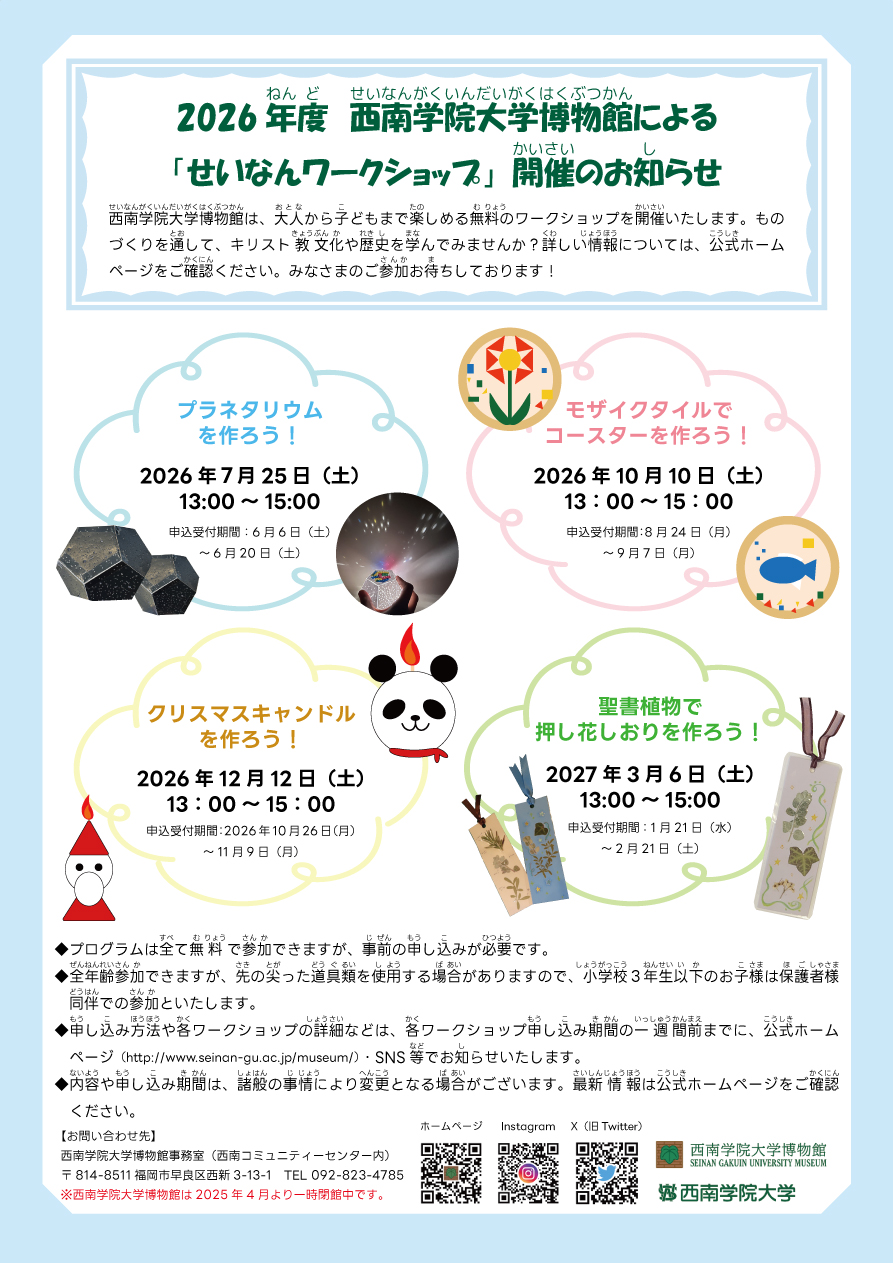 西南学院大学博物館では、2026年度も大人から子供まで「楽しみながら学ぶ」ことができる、様々なワークショップを開催する予定です!ものづくりを通して、キリスト教文化や歴史を学んでみませんか? 各ワークショップの詳細については、申込期間の1週間前までにこちらのページでお知らせいたします。 2026年度せいなんワークショップ年間スケジュール(PDF) ★「プラネタリウムを作ろう!」 2026年7月25日(土) 13:00~15:00 申込受付期間:6月6日(土)~6月20日(土) ★「モザイクタイルでコースターを作ろう! 2026年10月10日(土) 13:00~15:00 申込受付期間:8月24日(月)~9月7日(月) ★「クリスマスキャンドルを作ろう!」 2026年12月12日(土) 13:00~15:00 申込受付期間:10月26日(月)~11月9日(月) ★「聖書植物で押し花しおりを作ろう!」 2027年3月6日(土) 13:00~15:00 申込受付期間:1月21日(水)~2月21日(土) 注意事項: ●プログラムは全て無料で参加できますが、事前の申し込みが必要です。 ●全年齢参加できますが、先の尖った道具類を使用する場合がありますので、小学校3年生以下のお子様は保護者様同伴での参加といたします。 ●申込者多数の場合は抽選を行うことがあります。予めご了承ください。