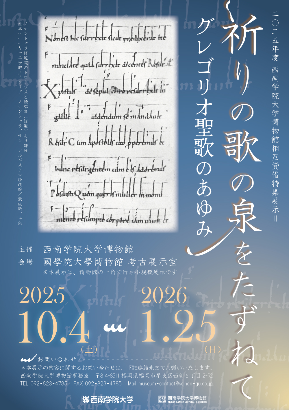 今回のサテライト展示は、グレゴリオ聖歌を主題として構成しています。「Qui bene cantat, bis orat.」(よく歌う人は、倍祈る)というラテン語の古いことわざにも示されている通り、キリスト教の営みには「歌うこと」が深く関わってきました。グレゴリオ聖歌とは、ローマ・カトリック教会で用いられる、単旋律・無伴奏の宗教音楽です。6世紀頃にはすでに典礼の中で歌われ、8世紀にローマからフランク王国(現フランス)に伝わり、8世紀末には西ヨーロッパ全土の修道院や教会に広がった歴史を持つグレゴリオ聖歌は、キリスト教音楽の源泉とも言え、現在まで親しまれています。本展示では、グレゴリオ聖歌のテキストや楽譜を通してグレゴリオ聖歌の歴史と現在、そして変遷する記譜法や装飾性について紹介します。